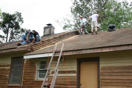 Men from Boone’s Creek Baptist Church near Lexington, KY, work on a roof in Waldhiem.
