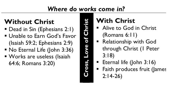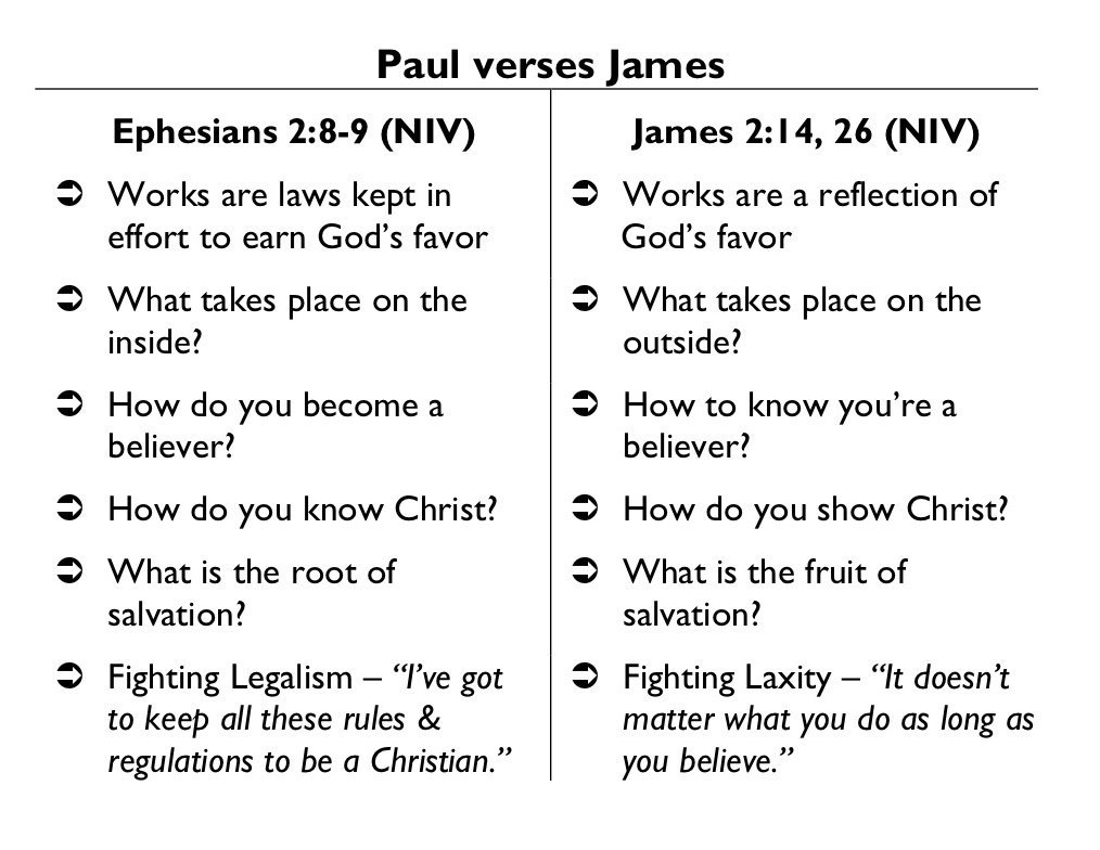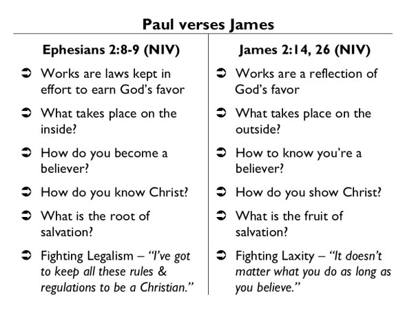 Touching on Faith and works this weekend at Bridge Church. Remembered these charts that I found helpful about the different motivations for the teachings of Paul and James. While Martin Luther thought James to be a “strawy epistle” and some use it to defend works based salvation, I believe they were dealing with different sides of the same coin. What is the place of works in the believers life?