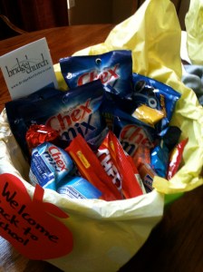 instead of thinking of ways to be a blessing (see Matthew 5:16, Philippians 2:3-4). We found one way that is enthusiastically accepted 100% of the time at our local schools: stuffing gift baskets full of goodies for teacher’s lounges at the beginning of the school year, holidays, & end of school. This year as part of our Faith in Action weekend, we focused on snacks, healthy & not so healthy. We’ve also done baked goods & office supplies. And always with a note of encouragement.