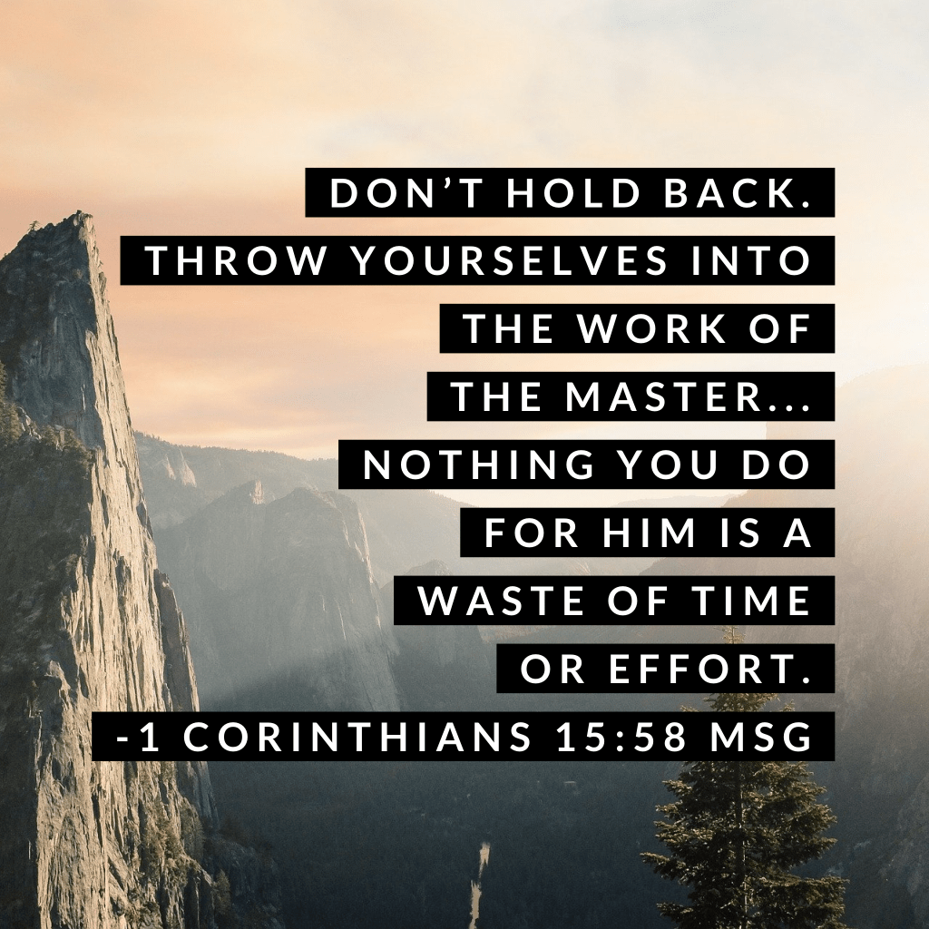 “don’t hold back. Throw yourselves into the work of the Master… nothing you do for him is a waste of time or effort.” 1 Corinthians 15:58 MSG