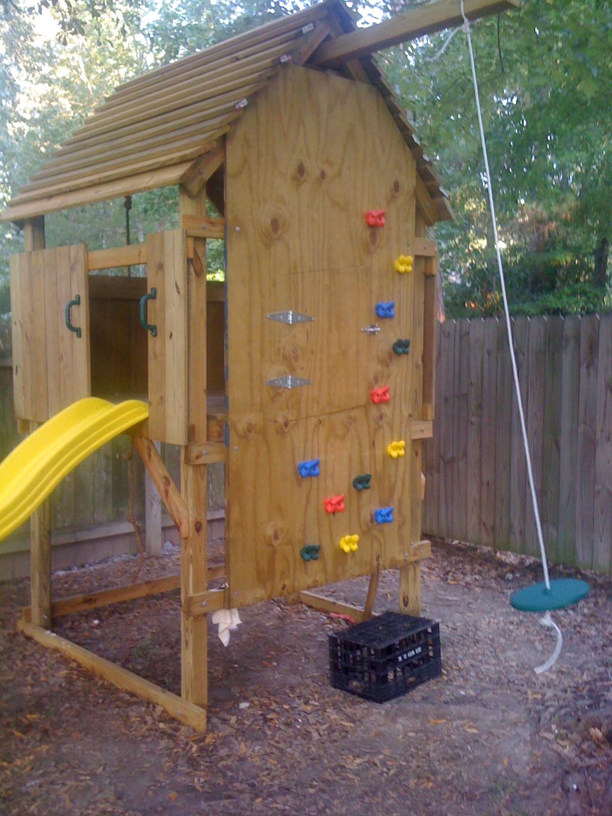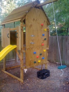 Club House. We’ve got a traditional swing in our subdivision playground, so I wanted to do something a little different. Found the plans here. Started on Memorial Day, finished on 4th of July. I know, I ‘m an amateur.