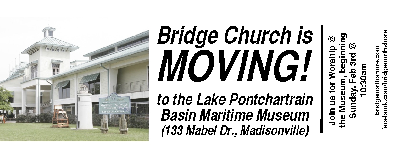 Beginning this weekend, February 3rd, Bridge Church will be gathering on Sunday’s 10:30am at the Lake Pontchartrain Basin Maritime Museum in Madisonville (Map It). Come early for coffee & donuts. More info about Bridge Church at BridgeNorthshore.com or Facebook.com/BridgeNorthshore.